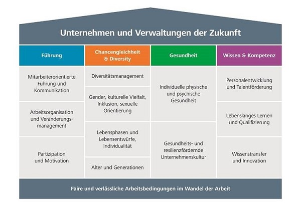 zentralen Themenfelder: Personalführung, Chancengleichheit & Diversity, Gesundheit sowie Wissen & Kompetenz.